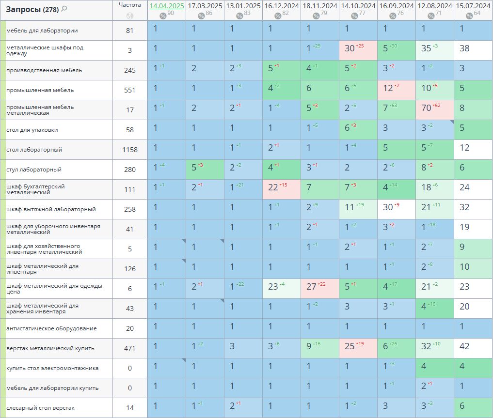 Сбор высокочастотных и среднечастотных запросов по теме производственной мебели, заказ и размещение текстов, прописывание мета-тегов.