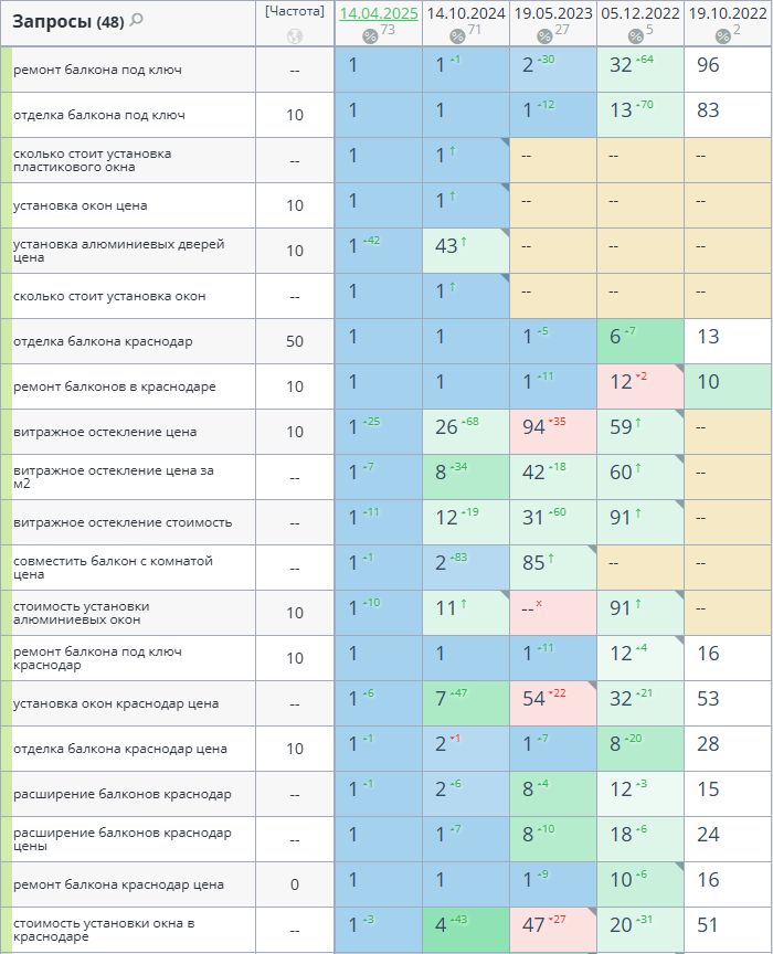 - Сбор высокочастотных и среднечастотных запросов по теме услуг ремонта и отделки балконов, установки окон.