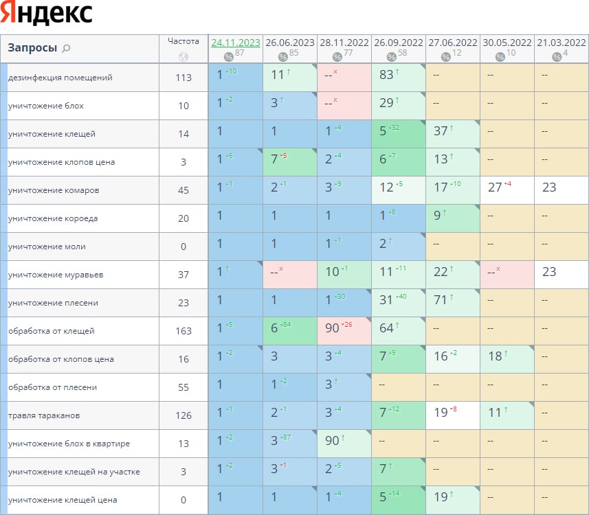 За время работы нам удалось поднять позиции в Яндекс с 18% до 71% в ТОП-10 и с 5% до 44% в ТОП-3.